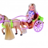 Sættet Evi Love i romantisk karet giver børn uendelige muligheder for historier – fra køreture som dronning eller prinsesse til hverdagslig omsorg for den lille hest. Evi sidder behageligt, holder tømmerne, og hendes matchende outfit understreger den magiske stemning i legen.