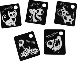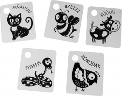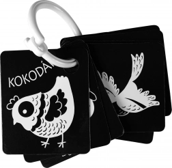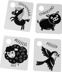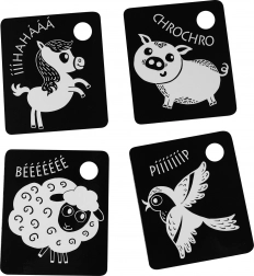 Kontrastkort i sort-hvid er et ideelt redskab til nyfødte og spædbørn, hvis syn reagerer bedst på enkle former og høj kontrast. Takket være det praktiske hul og plastikringen kan kortene nemt hænges over sengen, på barnevognen eller samles til et overskueligt sæt.