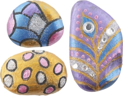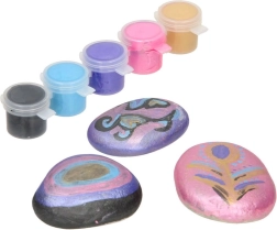 Sættet indeholder 3 naturlige sten, en pensel, 5 bøtter farve, lim, glitter og dekorationssten – du kan begynde at skabe med det samme.