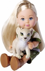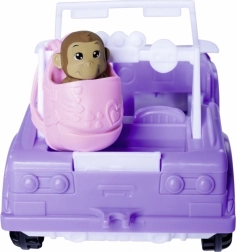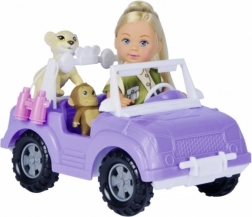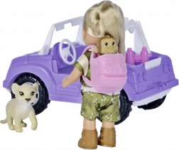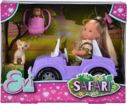 Tag på en eventyrlig *safari* tur med dukken Evička! Dette magiske sæt indeholder en smuk dukke, en terrængående bil, en lille abe, en løveunge og en kikkert.