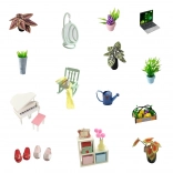 Miniaturet rummer detaljer som billeder, planter og musikinstrumenter for et æstetisk præg.