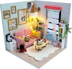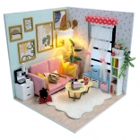 Byg dit eget stykke hyggeligt hjem i form af en miniaturestue, der efter færdiggørelse vil lyse op på en hylde eller et skrivebord. Sættet leveres usamlet, og takket være den detaljerede trin-for-trin-vejledning klarer du nemt limning og småjusteringer. Den integrerede LED-belysning giver scenen en autentisk atmosfære – batterier medfølger.