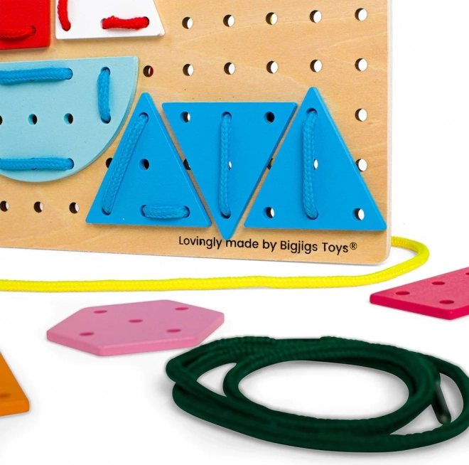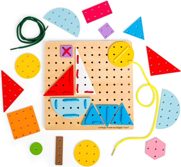 At trække snørebånd gennem huller i pladen og delene styrker fingrene, træner hånd–øje-koordination og forbedrer koncentrationen. En ideel aktivitet for førskolebørn.