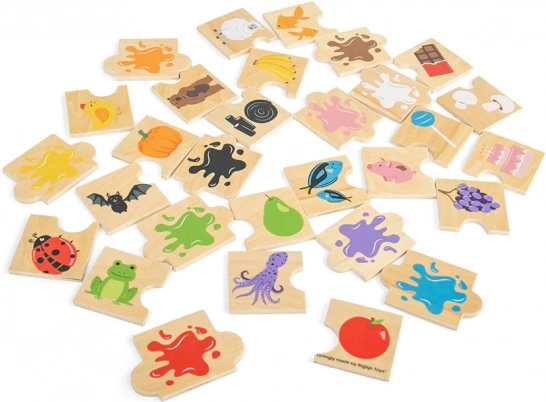 Det sjove, træbaserede didaktiske puslespil fra Bigjigs Toys lærer børn at genkende farver ved hjælp af 30 brikker i 10 farver. Børnene samler sæt af tre (dyr, genstand, farve), træner hånd-øje-koordination, logisk tænkning og udvider ordforrådet. Velegnet til børn fra 2 år.