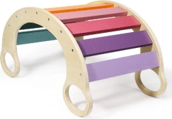 Elegant Montessori-gynge i glade regnbuefarver vil begejstre små nysgerrige opdagere. Den tilbyder multifunktionel anvendelse til at sidde, klatre og gynge, træner motorik, balance og koordination og passer takket være de kompakte mål i enhver indretning. Maksimal bæreevne 75 kg, stabil trækonstruktion og 4 praktiske håndtag for sikker greb.