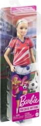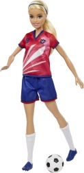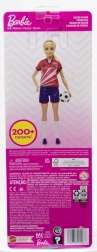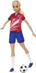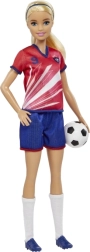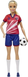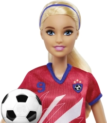 Barbie fodboldspiller inspirerer børn til aktiv og fantasifuld leg. Hun har langt blond hår sat i hestehale, rød trøje med hvide striber og nummer 9, holdmærke, blå shorts, fodboldstøvler og høje hvide sokker. Sammen med den medfølgende bold er hun klar til både træning og den store kamp.