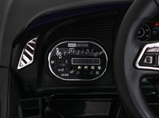 Forældre vil sætte pris på sikkerhed og kontrol takket være 2,4G fjernbetjeningen med tre hastigheder og sikkerhedsknappen Stop. Børn vil nyde de funktionelle LED-lys for og bag, rat med horn og melodier samt afspilning af yndlingsmusik via USB/SD/AUX. Det komfortable sorte sæde i økolæder med sikkerhedsseler og åbnebare døre understreger den realistiske oplevelse.