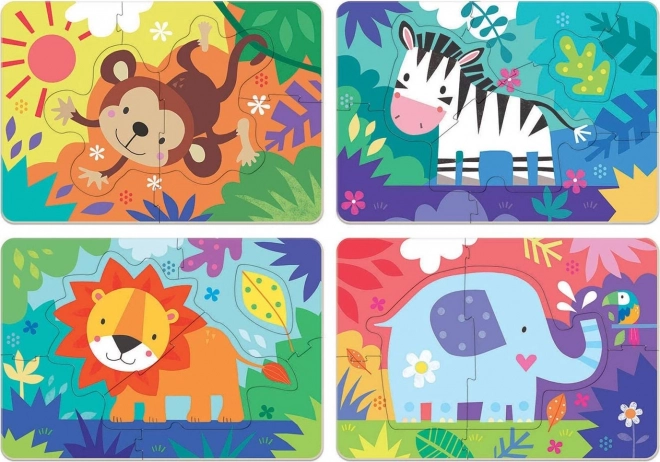 Sættet inkluderer fire individuelle puslespil med motiver af dyr – abe, zebra, løve og elefant. Udover at børnene samler hele billeder, kan de også tage individuelle dyr ud og samle dem separat. Dimensionerne for det færdige puslespil er ca. 24 x 16 cm.