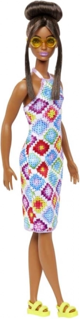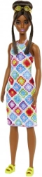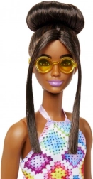 BARBIE Fashionistas-dukken hylder mangfoldighed og personlig stil. Hun er klædt i en iøjnefaldende kjole med geometrisk patchworkmønster, der lyser op selv på en grå dag. Den elegante frisure med knold og lokker omkring ansigtet matches af stilfulde briller og moderne sandaler – klar til ethvert eventyr.