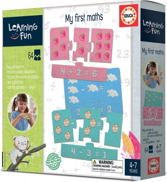 Læringspuslespillet og spillet Min første matematik fra serien EDUCA Learning is Fun er en fremragende hjælper for førskolebørn og yngre skolebørn. På legende vis ledsager det dem gennem de første skridt i matematik – fra genkendelse af tal til enkle regneopgaver. Børn samler fire-delte puslespil, hvor hvert korrekt resultat passer på sin plads, hvilket styrker forståelsen af sammenhænge.