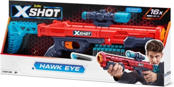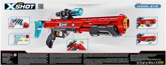 Forbedr din præcision med Zuru X-Shot Hawk Eye for perfekt skydning op til 27 meter med aftageligt sigte og ekstra magasin til 16 pile.
