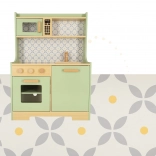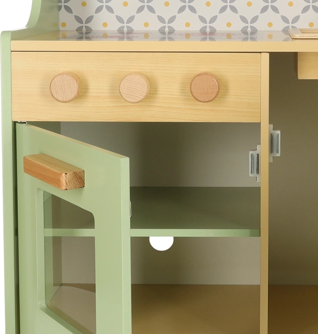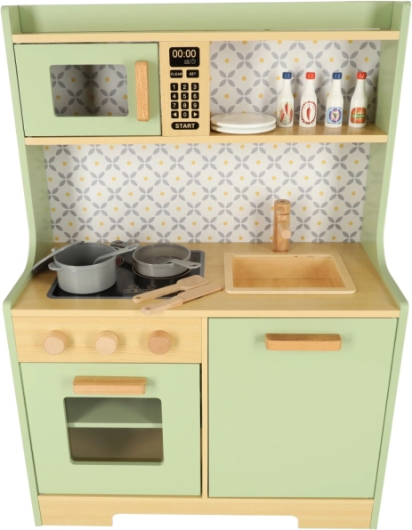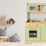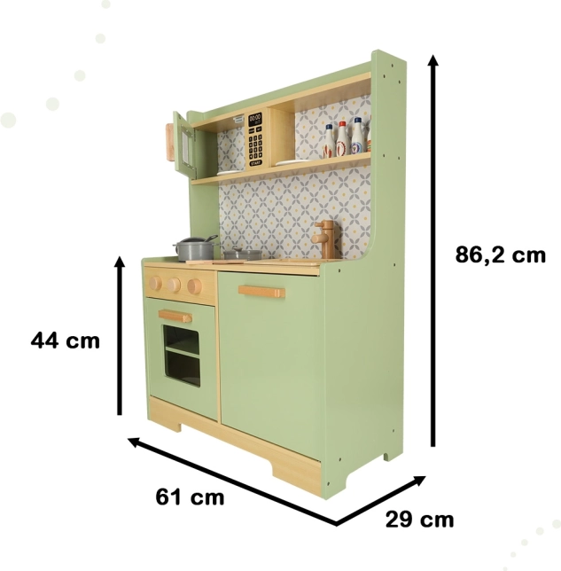 Lad børn imitere forældrene i et sikkert miljø med det mintgrønne træbørnekøkken. Det indeholder alle nødvendige elementer som ovn, mikrobølgeovn, bevægeligt komfur og vask, der udsender realistiske lyde for at gøre madlavningssimuleringen så autentisk som muligt.