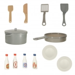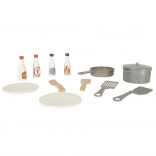 Sættet inkluderer et rigt udvalg af tilbehør, som omfatter en plastpande, en gryde med låg, træbestik og tallerkener. Der mangler ikke fire forskellige slags saucer for at pifte retterne op.