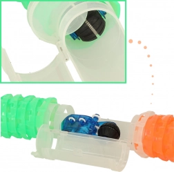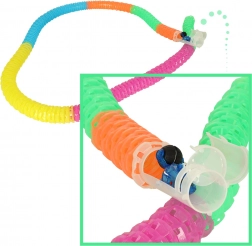 Det kreative samlesystem gør det muligt at bygge banen i to tilstande: frit for fleksible sving eller fast for stabile vertikale konstruktioner. Takket være det indbyggede lys giver bilen en flot effekt i skumringen og sikrer et imponerende show.