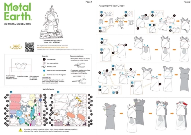 Fjern de enkelte dele fra metalpladerne; om nødvendigt kan du bruge en lille bidetang (medfølger ikke). Delene forbindes ved hjælp af låse bestående af en tap (krog) og et hul. Bøj tappen med en lille spidstang (medfølger ikke), og saml gradvist alle låsene, indtil der opstår et meget realistisk mesterværk!