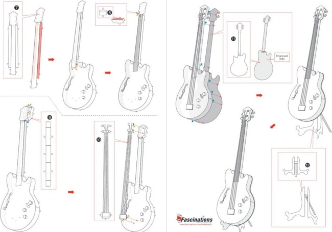 Fjern de enkelte dele fra metalpladerne; brug om nødvendigt en lille bidetang (ikke inkluderet). Delene forbindes med låse bestående af en tap (krog) og et hul. Bøj tappen med en lille spidstang (ikke inkluderet), og forbind gradvist alle låse, indtil der opstår et meget realistisk mesterværk!