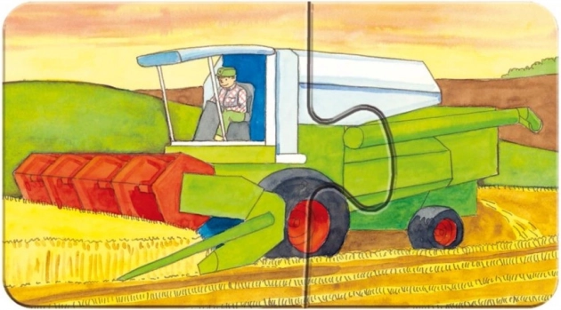 Billederne fra gården – fra søde kyllinger til traktor og mejetærsker – udvikler naturligt ordforråd og fantasi. Den specielle overflade med linnedimprægnering sikrer et mat billede uden forstyrrende genskin. Puslespillene er lavet af genanvendt karton, hvilket også glæder med sin bæredygtighed.