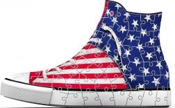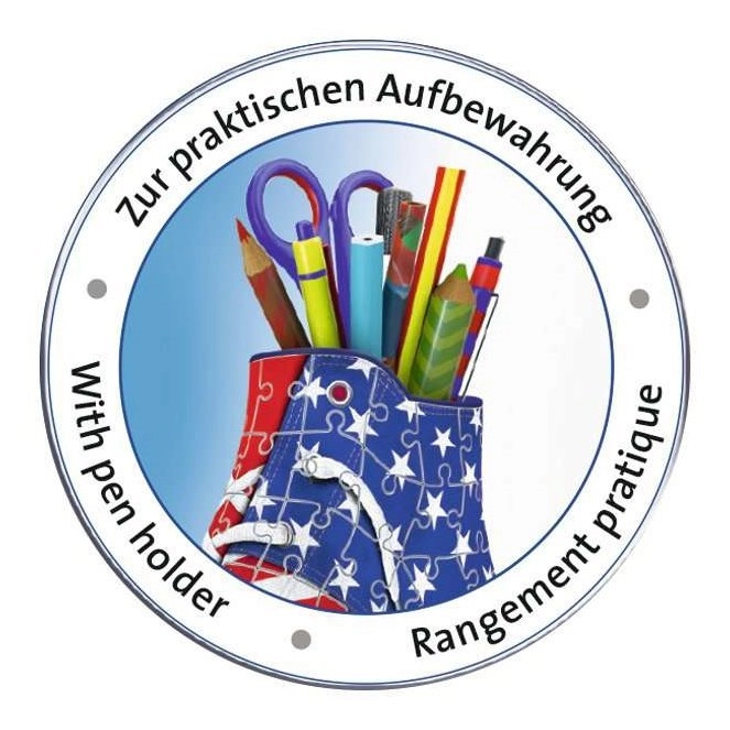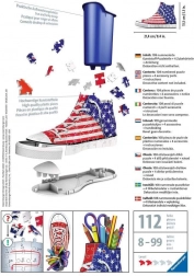 Genial kombination for sneaker- og puslespilselskere! Sæt et 3D-puslespil i en usædvanlig form, der frisker dit bord op... RAVENSBURGER har kastet sig over produktion af 3D-sneakers, som kan bruges som originale penneholdere til kuglepenne, farveblyanter eller pensler. Specielle buede eller fleksible brikker, der passer præcist på deres plads, gør det muligt at bygge en design-sneaker med print af det amerikanske flag, som ser meget realistisk ud. Brikkerne er fremstillet af solid plast og sikrer fremragende stabilitet. Skoen holder uden behov for lim. Pakken indeholder: 108 nummererede puslespilsbrikker, 4 tilbehørsdele og en vejledning. Indholdet i sneakeren, som er vist på billedet, er ikke en del af pakken. Mål på det samlede puslespil ca. 21,4 x 13,5 cm