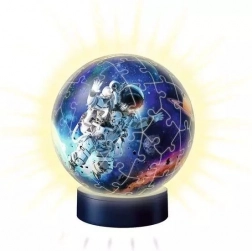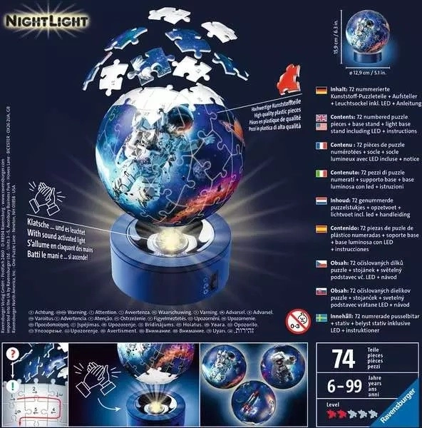 Takket være nattudgaven Nachtlicht fra Ravensburger kan også dit barn få en fortryllende lysende kugle med rumtema. Puslespillet er meget populært ikke kun på grund af den nemme håndtering, men også stabiliteten. Du behøver ikke lim for at samle det; de specialfremstillede buede brikker låser let i hinanden og holder formen. Man kan samle efter billedet eller efter numrene – de plastiske brikker er nummererede på bagsiden. Diameteren på puzzleballen er 13 cm. Pakken indeholder: