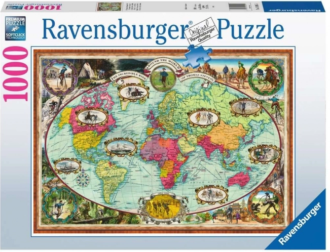 Nyd puslespil i høj kvalitet fra RAVENSBURGER med motivet Verden rundt på cykel. Sættet indeholder 1000 brikker, og det færdige puslespil måler cirka 70 × 50 cm – ideelt til afslapning, træning af koncentration og som smuk indretningsdekoration.