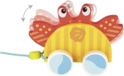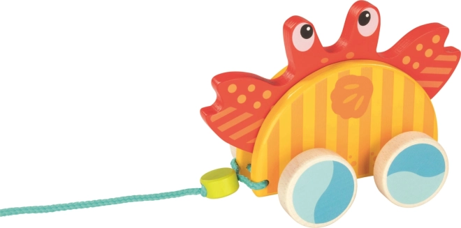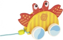 Dette farverige træklegetøj formet som en krabbe er lavet af kvalitets massivt træ, hvilket sikrer lang holdbarhed og sikkerhed for børn. Legetøjets hjul minder om havbølger, hvilket gør det til en legende og iøjnefaldende del af børneværelset.