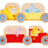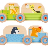 Træbyggesættet Mit lille tog er en perfekt måde at introducere dit barn til byggesættets magi. Det består af 16 dele, inklusive to lokomotiver og to vogne, som kører dyr på tur.