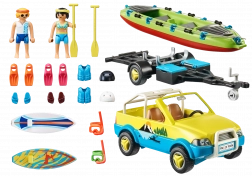 Sættet PLAYMOBIL FAMILY FUN strandbil med bådtrailer bringer en farverig verden af sommeraktiviteter – fra bølger til surfere til roligt padleri i kano. Den robuste bil med holdere til brætter og trailer til båd giver masser af legescenarier og klarer let enhver tur til vandet.