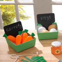 Dette realistiske sæt understøtter læring gennem leg. Børn kan udforske forskellige typer frugt og grøntsager, stifte bekendtskab med æg, honning og mælk og træne vejning ved boden. Et godt valg til hjemmebutik og legekøkken.