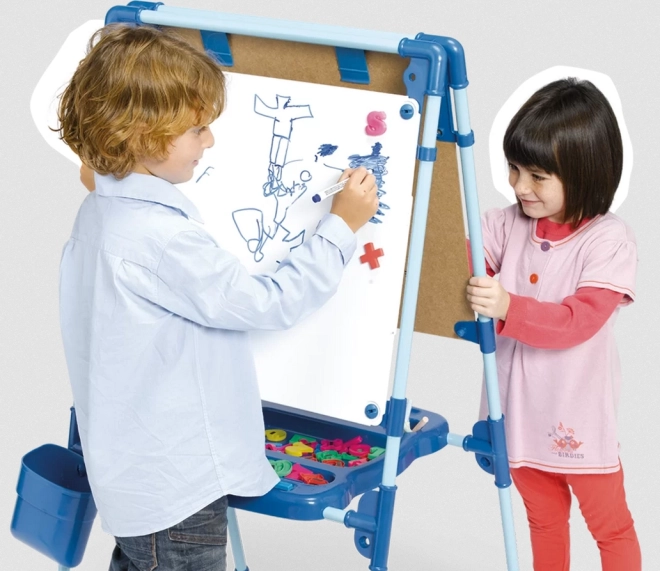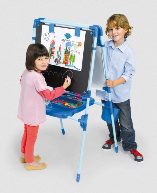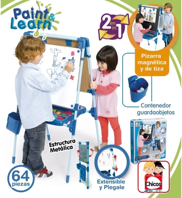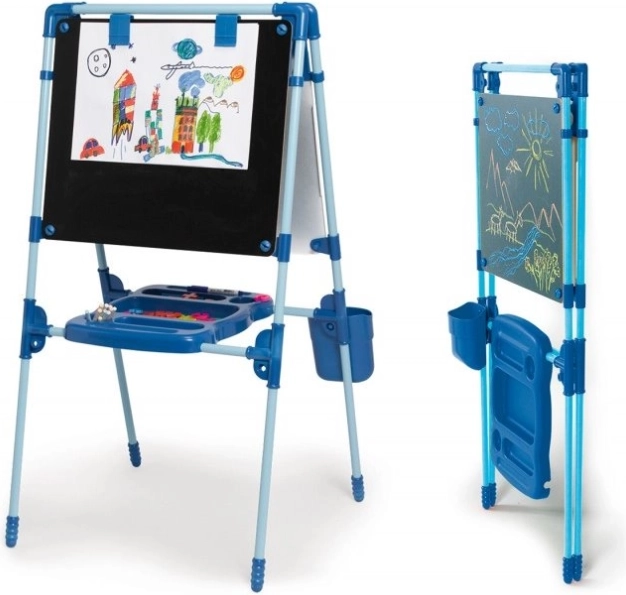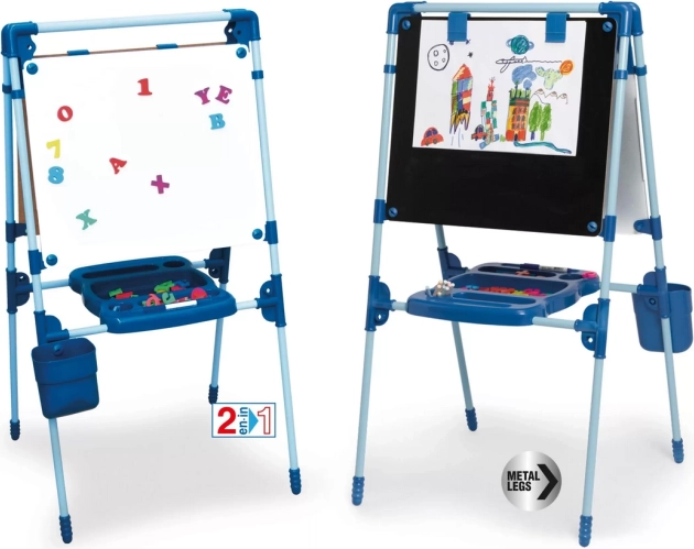 Den dobbeltsidede børnetavle 2-i-1 CHICOS støtter både tegning og læring. Den ene side er hvid og magnetisk til tuscher, den anden sort kridttavle til klassisk kridt. Den tilbyder justerbar højde, sammenklappelig konstruktion for nem opbevaring, klips til papir og en praktisk opbevaringshylde. Medfølger 64 magneter til legende træning af bogstaver og tal.