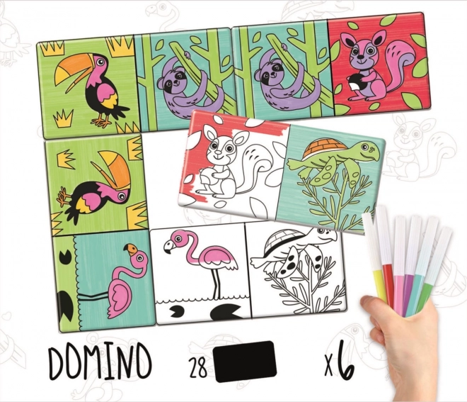 Farvelægnings-domino fra serien "Colouring Activities" er det ideelle valg for børn, der elsker kreativ leg. Farvelæg først dyrebillederne, og nyd derefter det klassiske spil, beriget med dit barns personlige kreative præg.