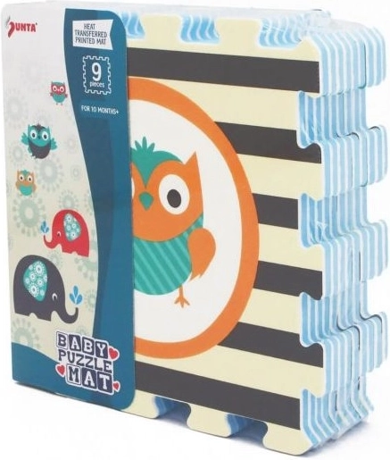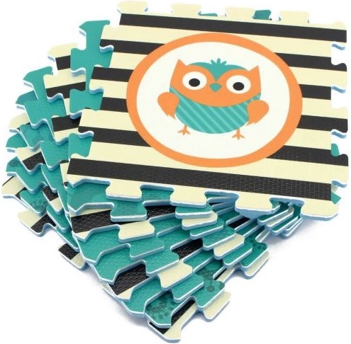 Skumgulvspuslespil med tryk af søde ugler og elefanter. Skumtæppet er velegnet til børn allerede fra 10 måneder. Det er ideelt til at skabe en legeflade ikke kun på børneværelset, men alle steder, hvor børn leger, og hvor trægulv, fliser eller linoleum er for kolde. Skumgulvspuslespillet er blødt, vaskbart, sundhedsmæssigt ufarligt, dæmper støj og isolerer fremragende. Tykkelsen på brikkerne er 1 cm.