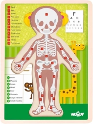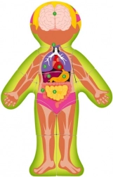 Dette kvalitets-træpuslespil udvikler barnets fantasi, finmotorik og logiske tænkning. Barnet samler tolv brikker med et billede af en pige, og på brikkernes bagside finder det markerede menneskelige organer. Baggrundsbilledet viser menneskets skelet og indeholder en nummereret liste over organer og knogler – et glimrende udgangspunkt for den første introduktion til anatomi på engelsk.