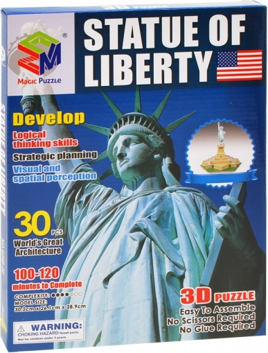 Byg den ikoniske Frihedsgudinde som et 3D-puslespil af holdbart skum med lamineret papir. Samlingen er uden lim og saks – brikkerne trykkes blot ud af arkene. Den færdige model er et dekorativt element til hjemmet eller kontoret og en fantastisk måde at udvikle logisk tænkning og tålmodighed på.