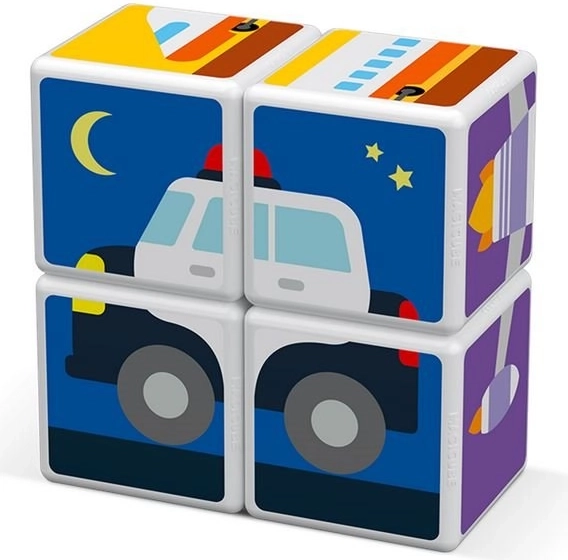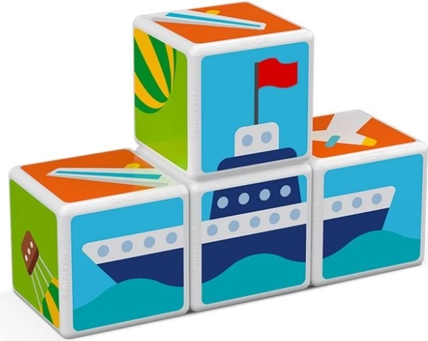 GEOMAG Magicube Printed Transport er et smart magnetisk byggesæt, der kombinerer leg og læring. Fire printede klodser med transportmotiver og tre dobbeltsidede kort inviterer børn til at samle biler, fly, raketter og andre billeder. Takket være magneter på alle kanter er bygningen intuitiv og sikker.