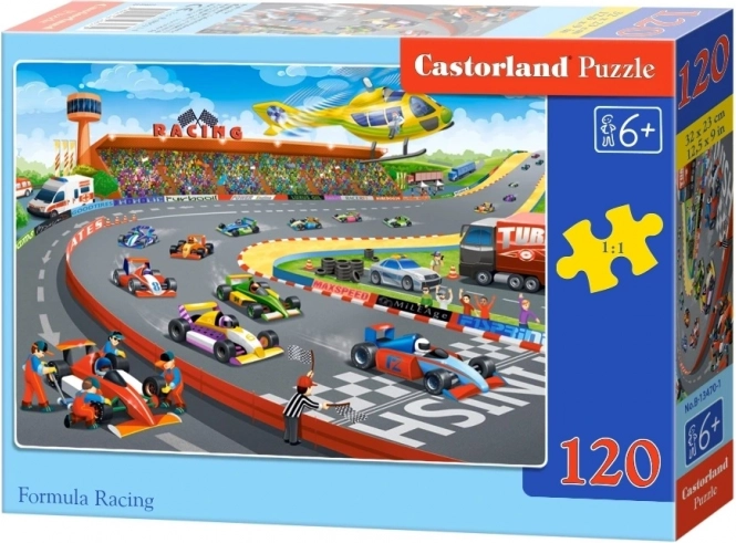 Sjovt puslespil til børn med 120 brikker med motivet FORMULA RACING, som vil glæde små fans af hurtige biler. Når det er samlet, bliver det til et billede på 32 × 23 cm, der imponerer med kvalitetsprint og levende farver. Et glimrende valg til at udvikle koncentration og tålmodighed fra 6 år.