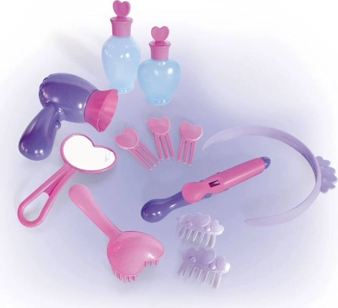 - 12 stk. tilbehør – flasker, hårtørrer, hårbånd, hårspænder m.m. til realistisk leg.
