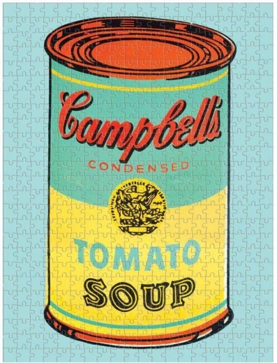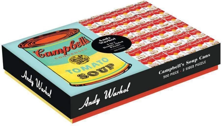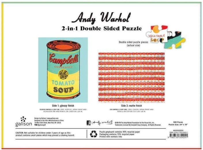 Det dobbeltsidede puslespil Andy Warhol Soup Can fra Galison indeholder to versioner af Warhols ikoniske popkunstværk. Puslespilsbrikkerne har en mat overflade på den ene side og en blank på den anden for nem sortering. Samlet puslespil ca. 61 x 46 cm