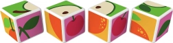 Farverige illustrationer af æble, kirsebær, banan, druer og appelsin hjælper med at genkende farver og former og udvider ordforrådet gennem leg.