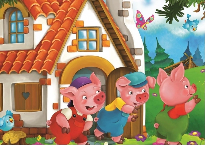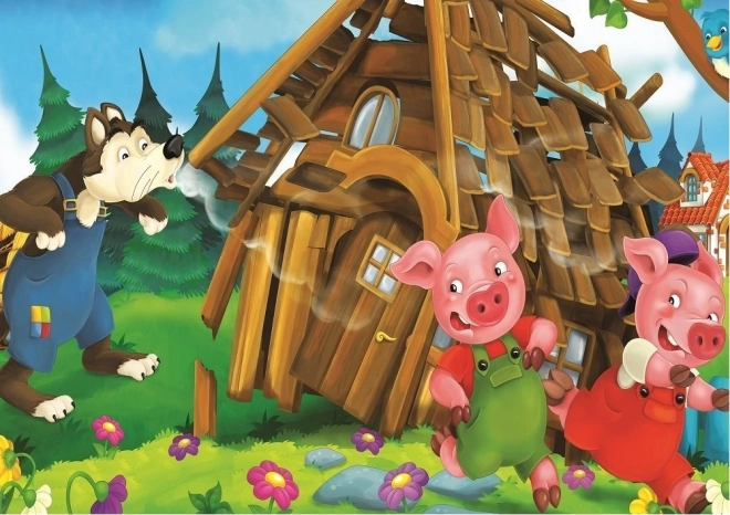 Nyd eventyret med motivet De tre små grise i form af et sæt med to puslespil. Hvert puslespil har forskelligt antal brikker (24 og 35), men de færdige billeder har samme mål 34 × 24 cm – ideelt til gradvis udfordring og sammenligning af sværhedsgrad.