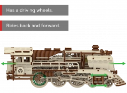 Lokomotivet bruger en elastikmotor og tandhjul, så det efter oprulning faktisk kører både frem og tilbage. Du kan se gear og stempler direkte i aktion.