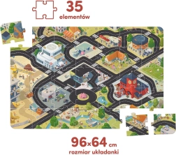 Opdag den travle lille by og dens indbyggere med det store gulvpuslespil. Gør legetøjsbilerne klar og kør ud på vejene! Planlæg din egen rute og besøg dine yndlingssteder. Illustrationer fulde af humor og detaljer inspirerer til kreativ leg. Inviter søskende og venner og nyd tiden sammen!