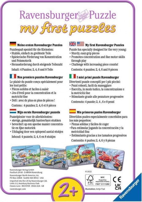 Oplev den første puslespilsglæde med Ravensburgers sæt til de mindste. Fire billeder af udrykningskøretøjer med progressivt antal brikker: 2, 4, 6 og 8 udvikler finmotorik, koncentration og fantasi. Ekstra kraftig karton og robuste brikker gør det nemt at håndtere og modstår små børnehænder. Ideelt fra 2 år.