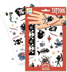 Tag på eventyr på det åbne hav med DJECOs midlertidige tatoveringer med pirattema. Fine illustrationer, mættede farver og sjove motiver glæder både børn og forældre – hvad enten det er til fødselsdagsfest, karneval eller som en lille belønning.