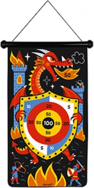 Bliv bedre til at kaste dart og få så mange point som muligt med et præcist mål! Den dobbeltsidede magnetiske dartskive kan hænges på væggen, et dørhåndtag eller et træ. 6 magnetiske pile uden spidser forhindrer skader og gør det muligt at spille allerede fra en tidlig alder. Felterne, du skal sigte efter, er arrangeret i en cirkel på den ene side og spredt ud over hele fladen på den anden. Dette spil, der træner fingerfærdighed og finmotorik, er mere end bare underholdning for børn og voksne. Det er ideelt til at udvikle dit barns dygtighed og koncentration. For børn i alderen 4 til 8 år. Produktmål: 44 x 4 x 65 cm.