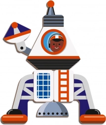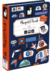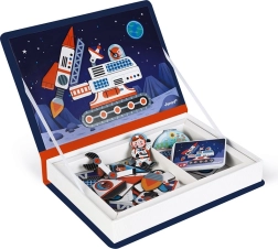 I æsken finder du 52 magnetiske dele og 18 kort med forlæg til rumfartøjer. Børn kan samle efter kortene eller lave egne kombinationer. Magneterne kan også bruges på andre magnetiske tavler eller overflader.