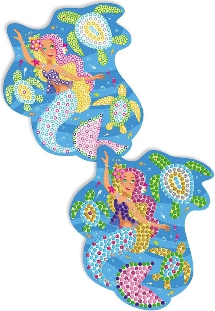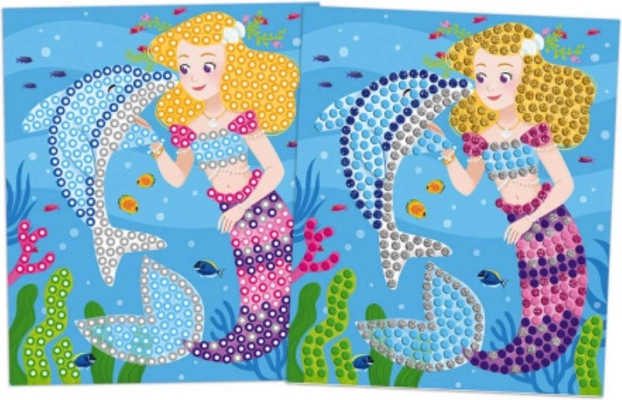 Kreativt sæt til børn fra 5 år, som udvikler finmotorik og fantasi. Indeholder 5 smukke billeder af havfruer og delfiner samt 10 ark glitrende og farvede klistermærker til mosaikskabelse. Nem at klistre, farverige motiver og langvarig underholdning hjemme og på farten.
