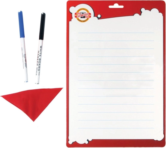 Oplev sletbar tavle fra Koh-i-Noor designet til effektiv træning i skrivning. Med fortrykt linjemønster er den ideel til at lære de korrekte forhold af håndskrevne og trykte bogstaver. I pakken finder du to markører i sort og blå samt en klud til nem aftørring af blæk.