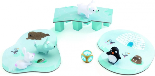 Sættet indeholder 4 detaljerede dyrefigurer (pingvin, isbjørn, fjellræv, hvid hare), 3 spilleplader med ismotiv, specialdele som fiskehuller, en bro, en iglo-plade og 6 søjler. Med enkle regler og et attraktivt design er spillet ideelt som den første kooperative oplevelse for førskolebørn.