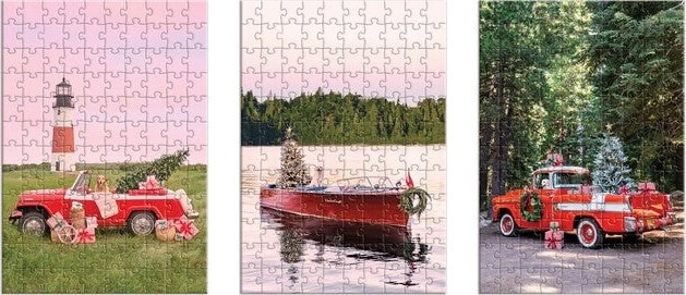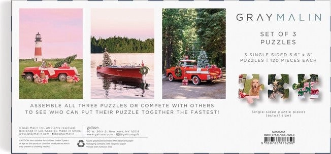 Gray Malin The Holiday 3-In-1 Puzzle Set indeholder tre puslespil med 120 brikker inspireret af bestsellere fra Gray Malins luftfotografier. Ideelt for alle, der vil fordybe sig i kunstfotografi og afslapning.