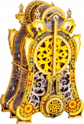 Følg tiden på separate urskiver for timer og minutter, og beundr tandhjulenes og pendulets arbejde i realtid.